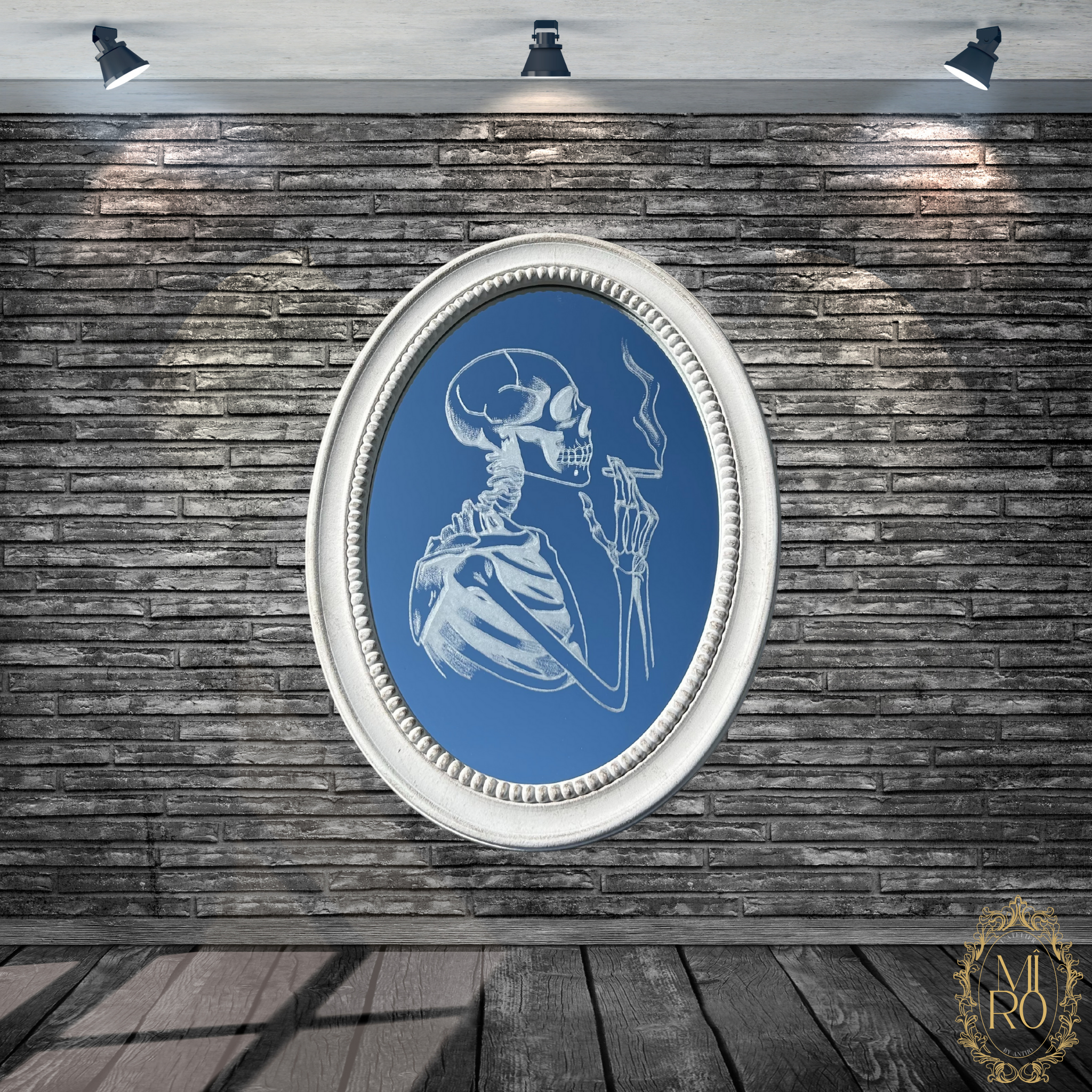 Un hommage ironique aux vanités d’antan, revisité avec une touche contemporaine. Ce miroir ovale met en scène un squelette, cigarette aux lèvres, immortalisé dans une gravure directe sur la surface du verre. L’image évoque l’éphémère avec désinvolture, oscillant entre memento mori classique et provocation moderne.